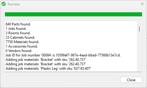 Once the report is uploaded, q "Success" notification will appear, displaying materials and quantities added to the Materials list for that job.