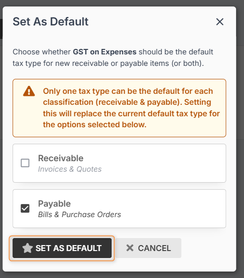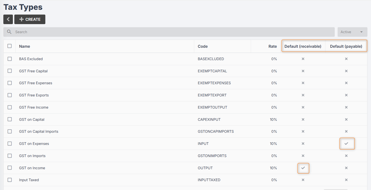 In general, these two default tax types should be different, e.g "GST on Expenses" is the default payable and "GST on Income" is the default receivable, as shown above.