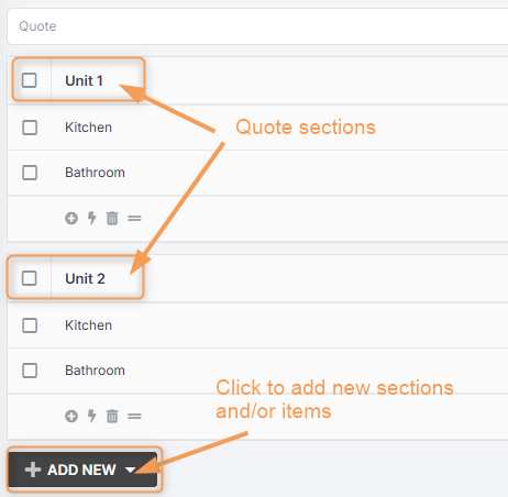 A section is simply a heading for one or more quote items. You may only want one section, called “Items”, which you can group all your quote items under. Or you might like to use sections to group items by type, area, etc.