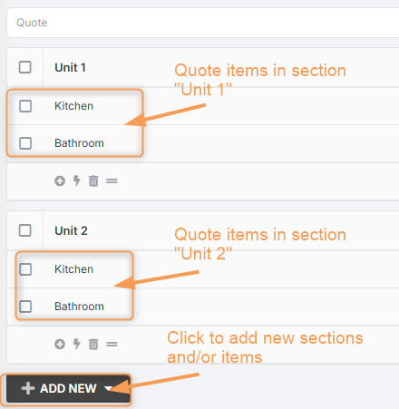 Example of quote items within sections, where each section is a unit, and each item is a room inside the unit that will be renovated.