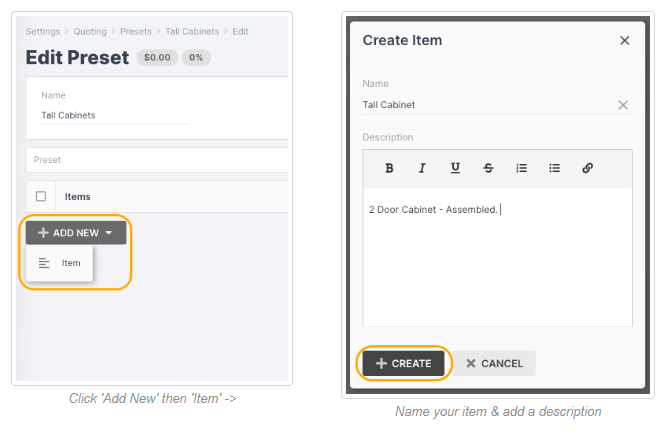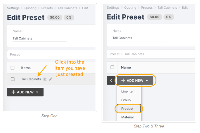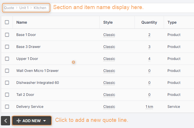 Example: You might have a preset called “Kitchen” which contains an exhaustive list of all your kitchen-type cabinets and other products. Then each time you create a quote for a kitchen, you can add the “kitchen” preset and select which specific combination of cabinets and other products your client wants.