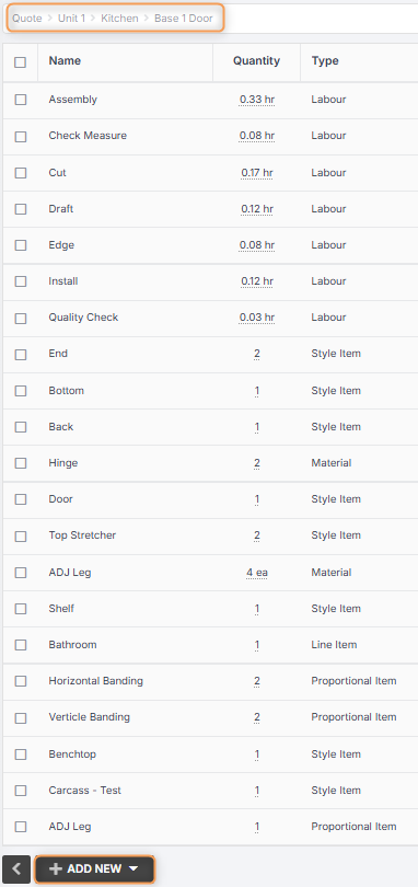 - Style Item: Use for parts that have more than one range option. For example, the product might be a drawer, and the style item might be “handles”. You might use cheaper or more expensive handles across different quotes. Setting the handle as a style item allows you to easily select the option you want for each quote. Some style items are also proportional (for example, benchtops), and will require parametric measurements.