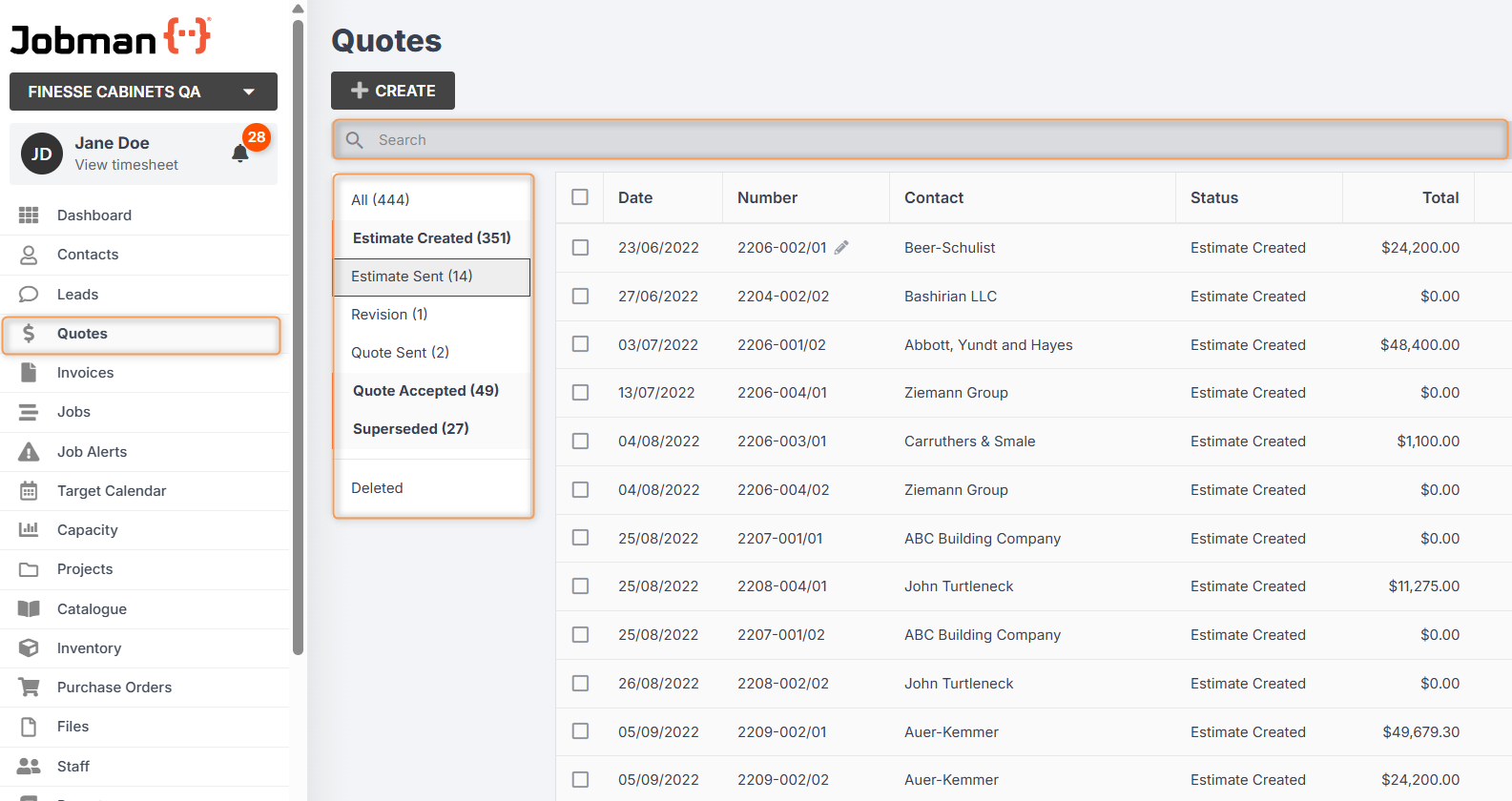 A quote, or estimate, is a breakdown of what the prospective customer (lead) wants, and how much your business would charge for it. Once accepted, a quote enables you to create a new job.