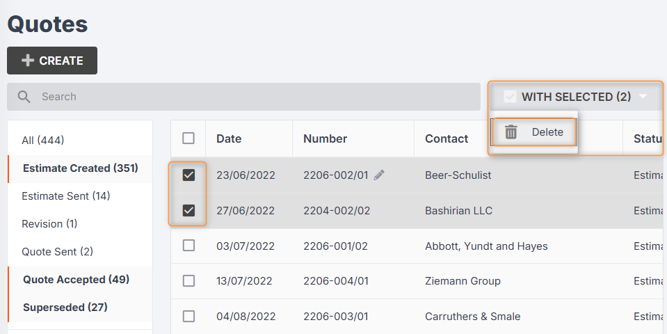 - Delete one or more quotes by selecting them using the checkboxes, then clicking With Selected > Delete: