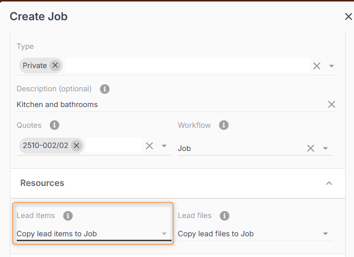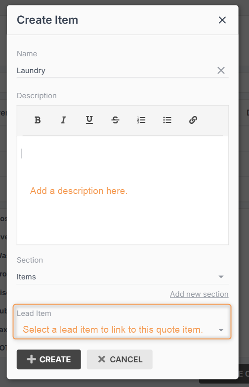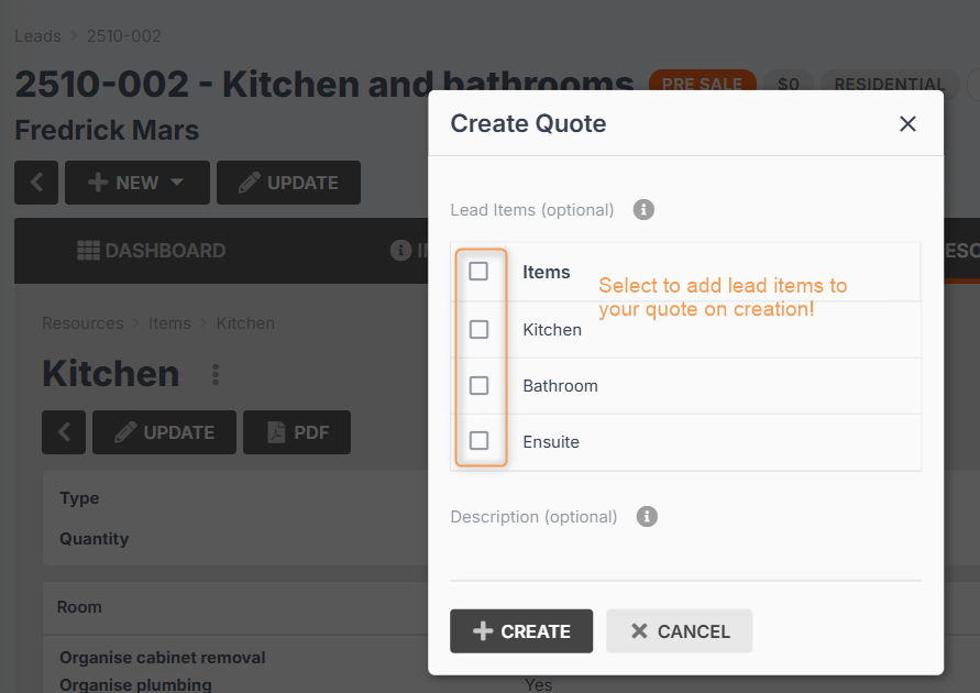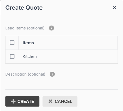 Select which lead items to bring into the quote (if applicable), and add a description if needed. Note: the quote description is separate from the lead description.