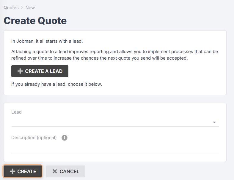You can also create a quote from the Quotes tab. Simply click Create, select or create a lead, add a description if needed, then click Create again: