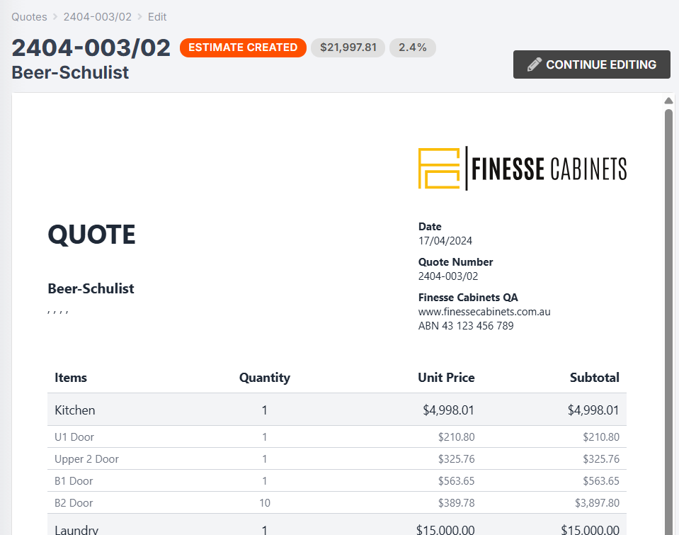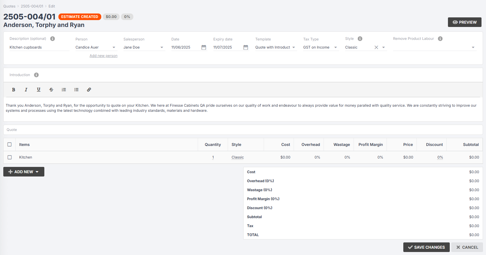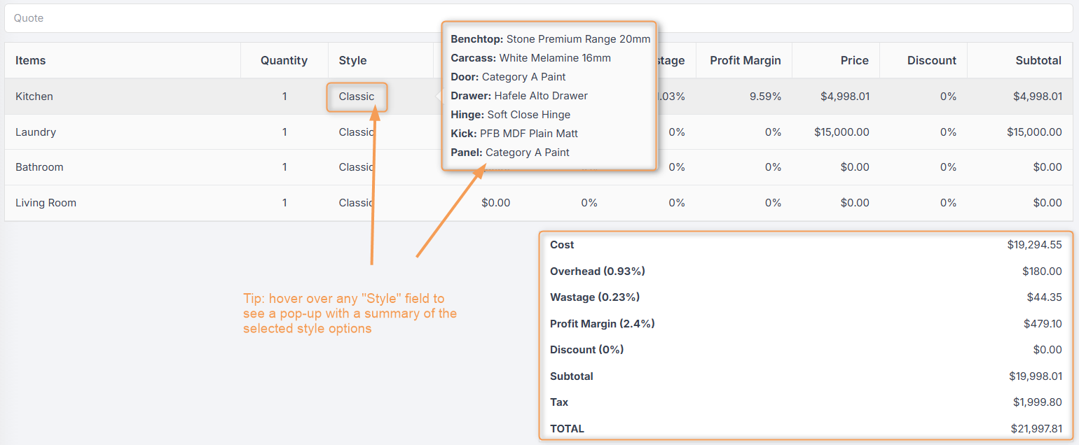 From here, you can simply edit each item's styles/ranges to bring in pricing, and add in any extras (such as materials, extra labour, services, etc.) to create a very fast and accurate quote.