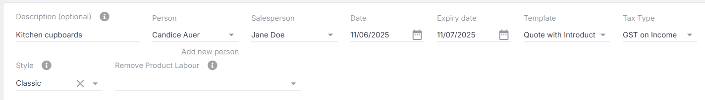 In the top section of your quote, you can use the drop-down menus to edit the quote description, contact person, salesperson, issue date, expiry date, quote template, tax type, style, and product labour: