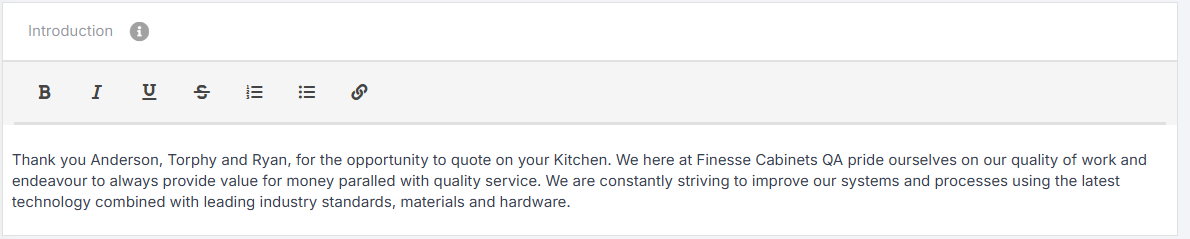 You can use the quote introduction to summarise what your client will see in the quote. This allows for easy information handling without needing to add detailed descriptions to each quote item.