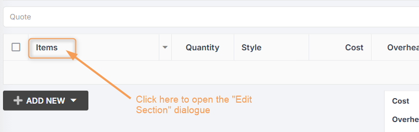 If you have created your quote from a lead with items, your quote should already have at least one section and any lead items set up already.
