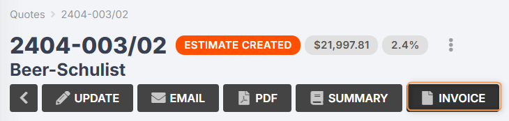 Tip: Change the quote status by clicking on the current status (in orange) next to the quote number. Remember, if you want to turn this quote into a job, the quote status must be Quote Accepted. This is automated when clients accept quotes via the link they are sent.