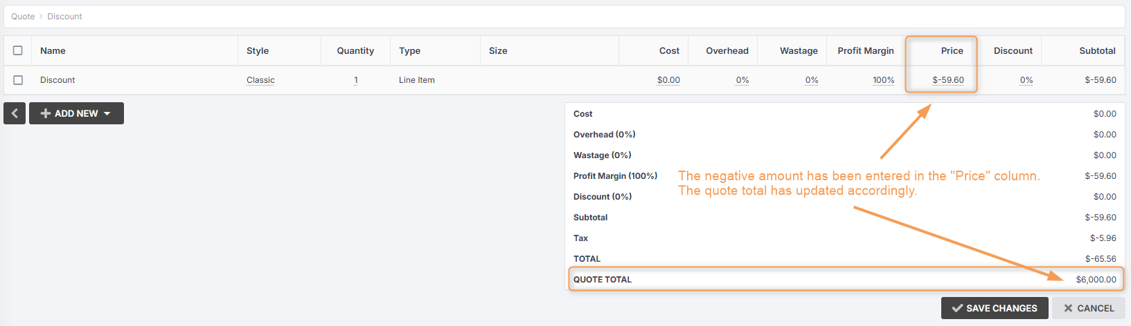 Now when you want to add a discount as a line item to your quote, you can add this preset to your quote section, then click into the “Discount” line item and add a negative value to the Price field, then save changes!