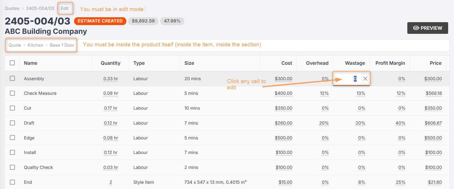 However, if needed, you can also click inside an item in a quote section to modify overhead/wastage/profit margin at the individual product level:
