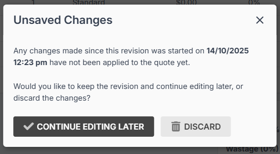 Jobman is a live quoting system. This means when you edit a quote, the changes you make are continually being cached and saved on what's called a "Revision version" of the quote. This means you don't have to keep hitting Save Changes as you go!