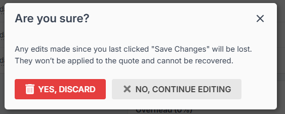 Although your changes are being cached and saved to a revision version as you go, they will not be committed until you press the Save Changes button. If you choose, you can instead click Cancel to discard any changes made and revert the quote to its last saved version:
