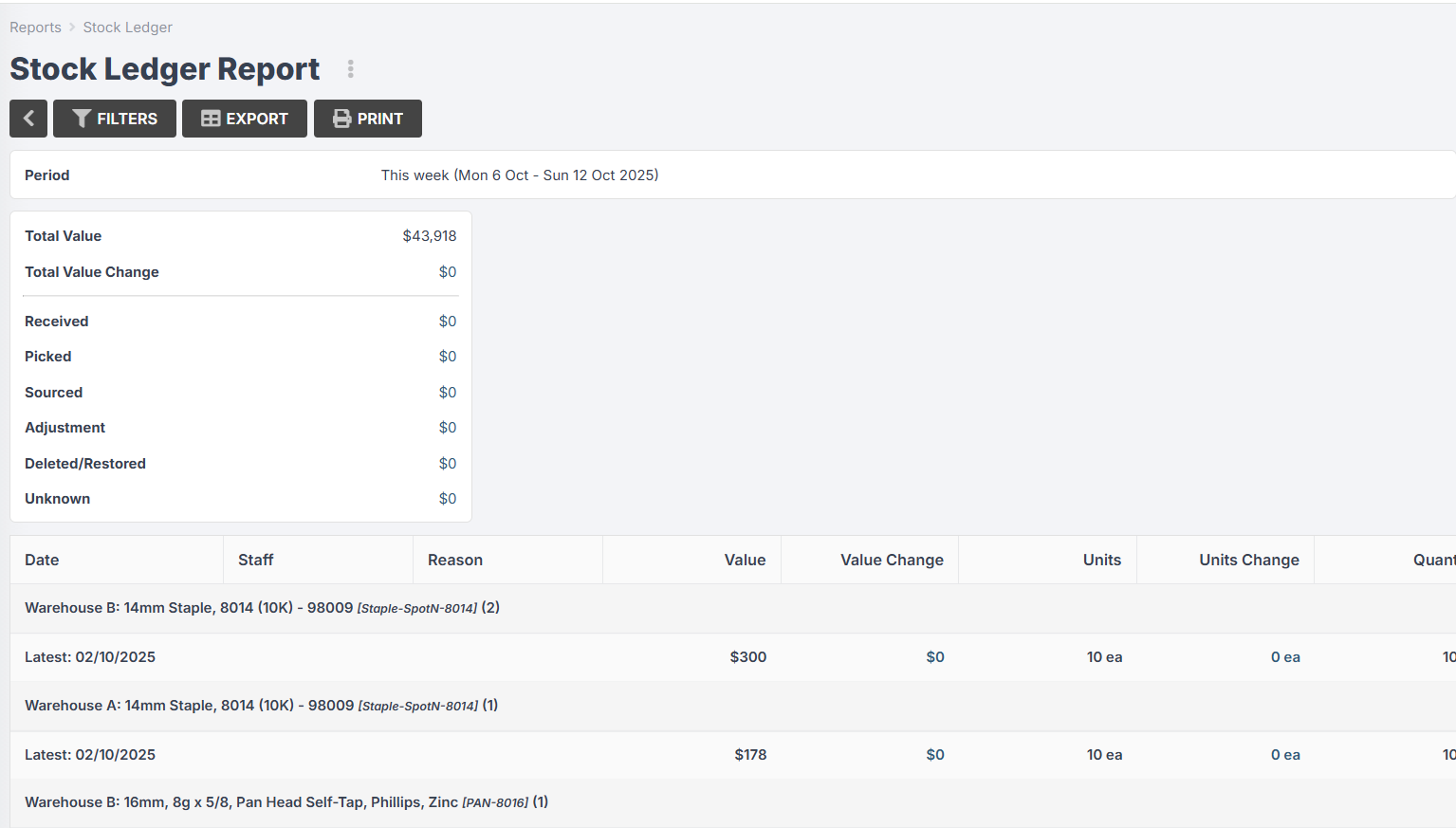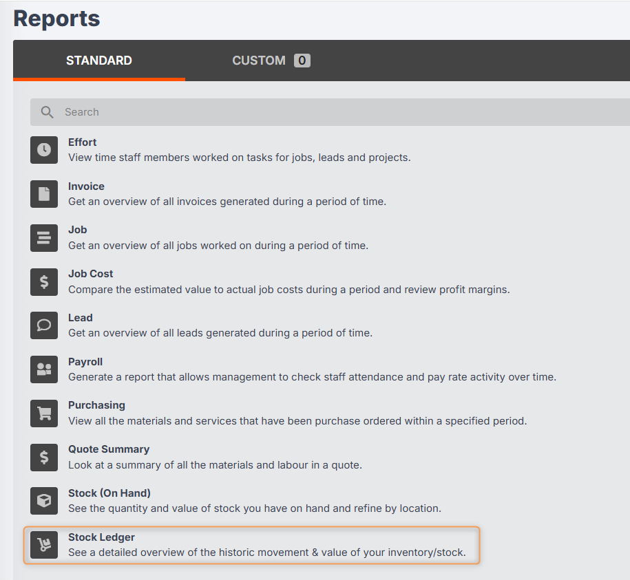 Use the Stock Ledger Report to track the historical movement of your inventory items within a given period! This report gives you a useful breakdown of which inventory items have been received, picked for jobs, sourced, and more.