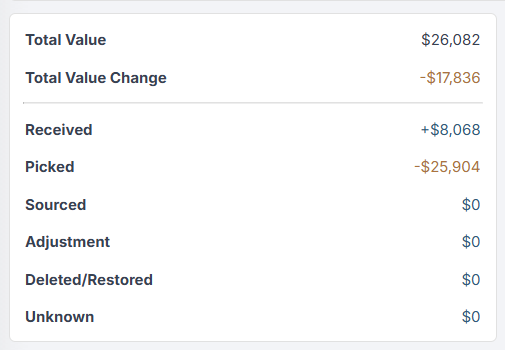 - Picked: The total cost of all stock picked for jobs during the specified period. This should always be a negative value.
