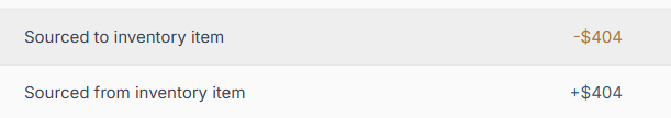 The second entry shows $404 worth of material was sourced to a job from inventory, lowering the total value back to $0.