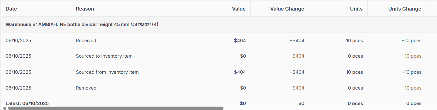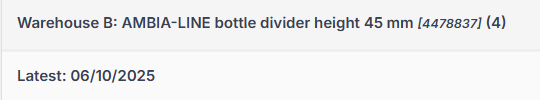 In the above example, the number (4) in the header means there are four entries for the material "AMBIA-LINE bottle divider height 45 mm [4478837] for location "Warehouse B." The footer states that the latest entry was made on 6/10/2025.