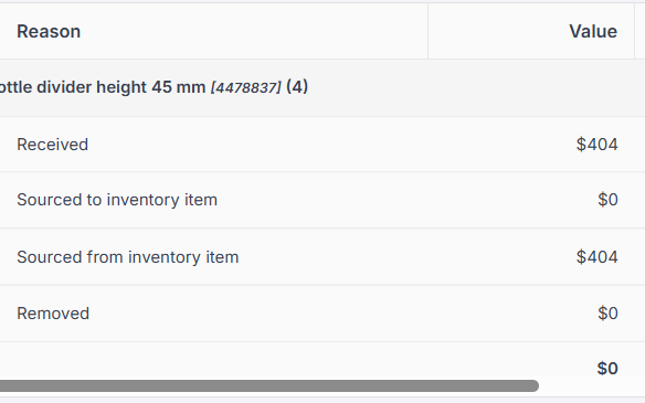 - Adjustment: This accounts for any manual changes made to inventory items by staff, e.g. changes in quantity or value.