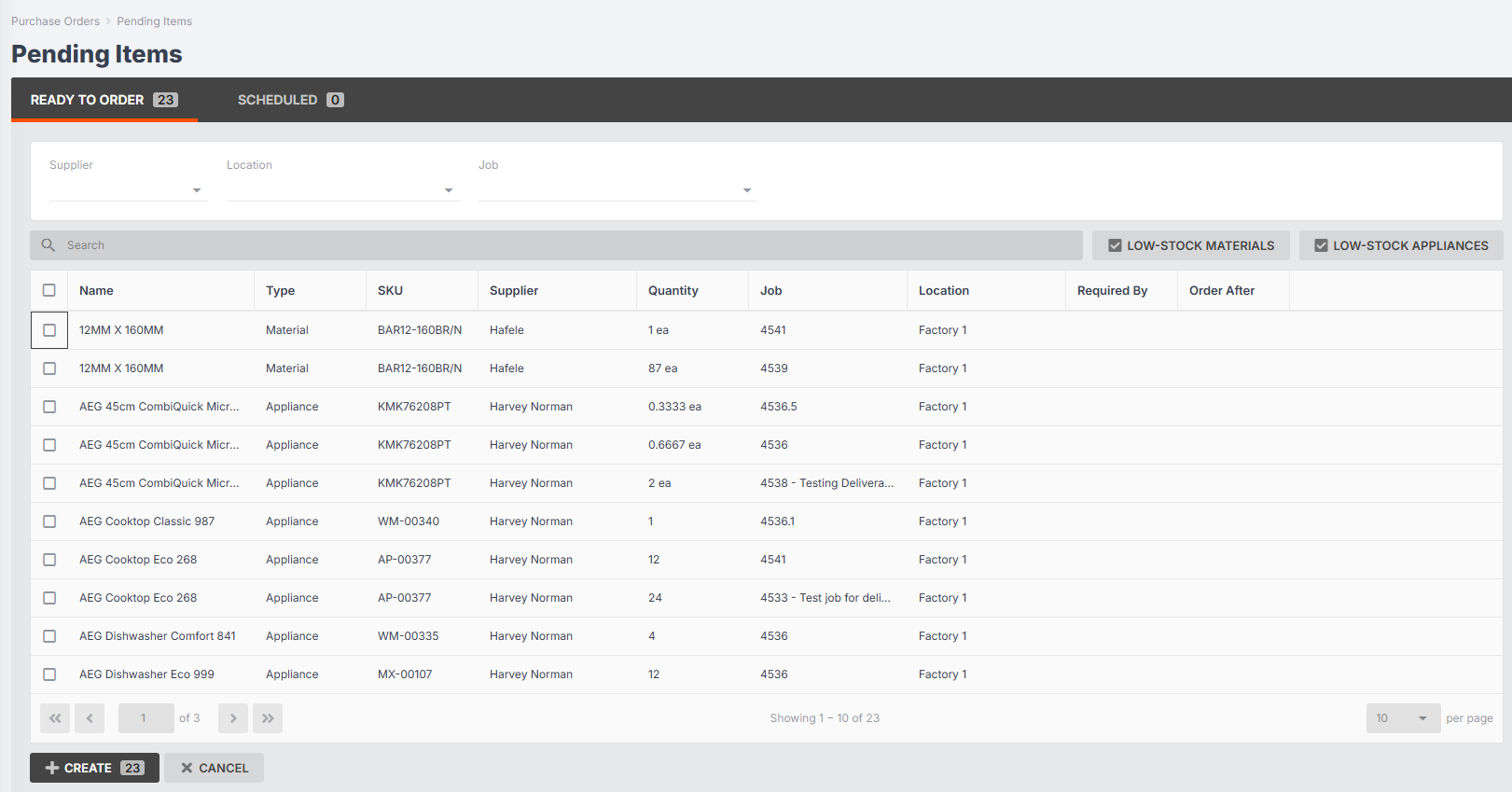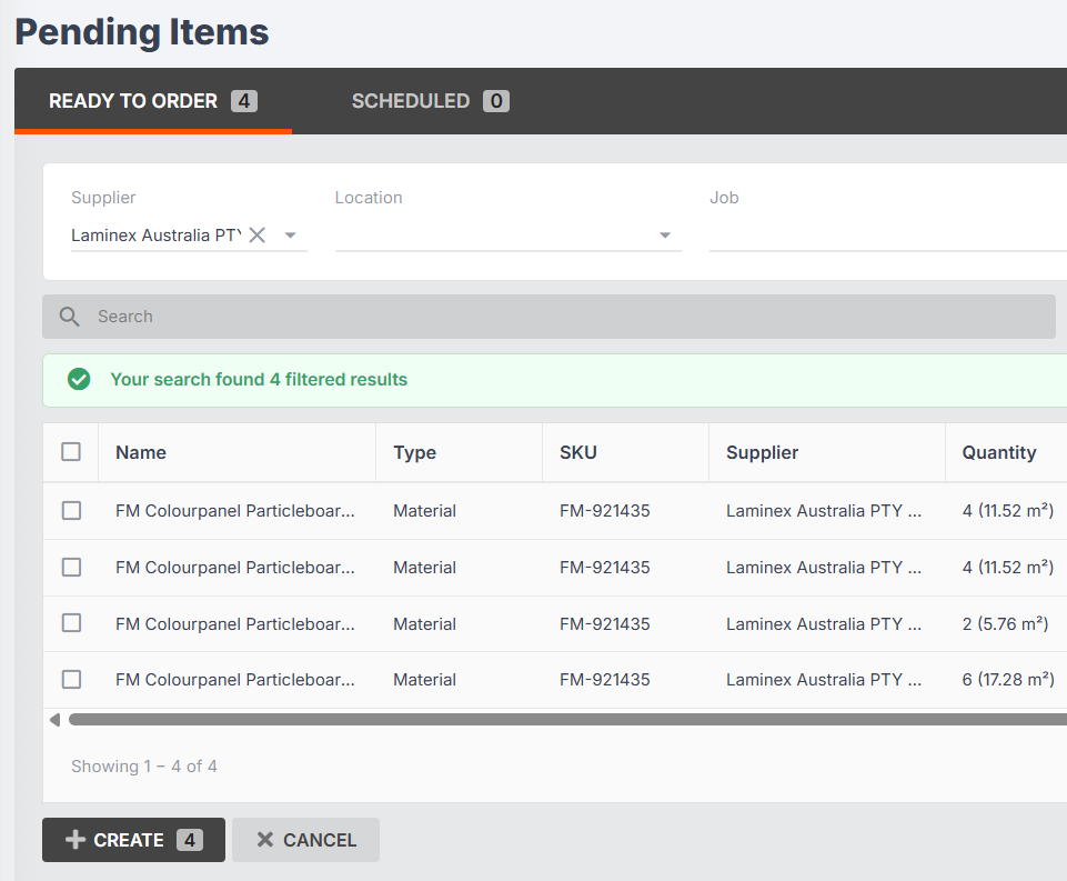 - When you have filtered your materials by a specific supplier, you can click Create to generate a purchase order.