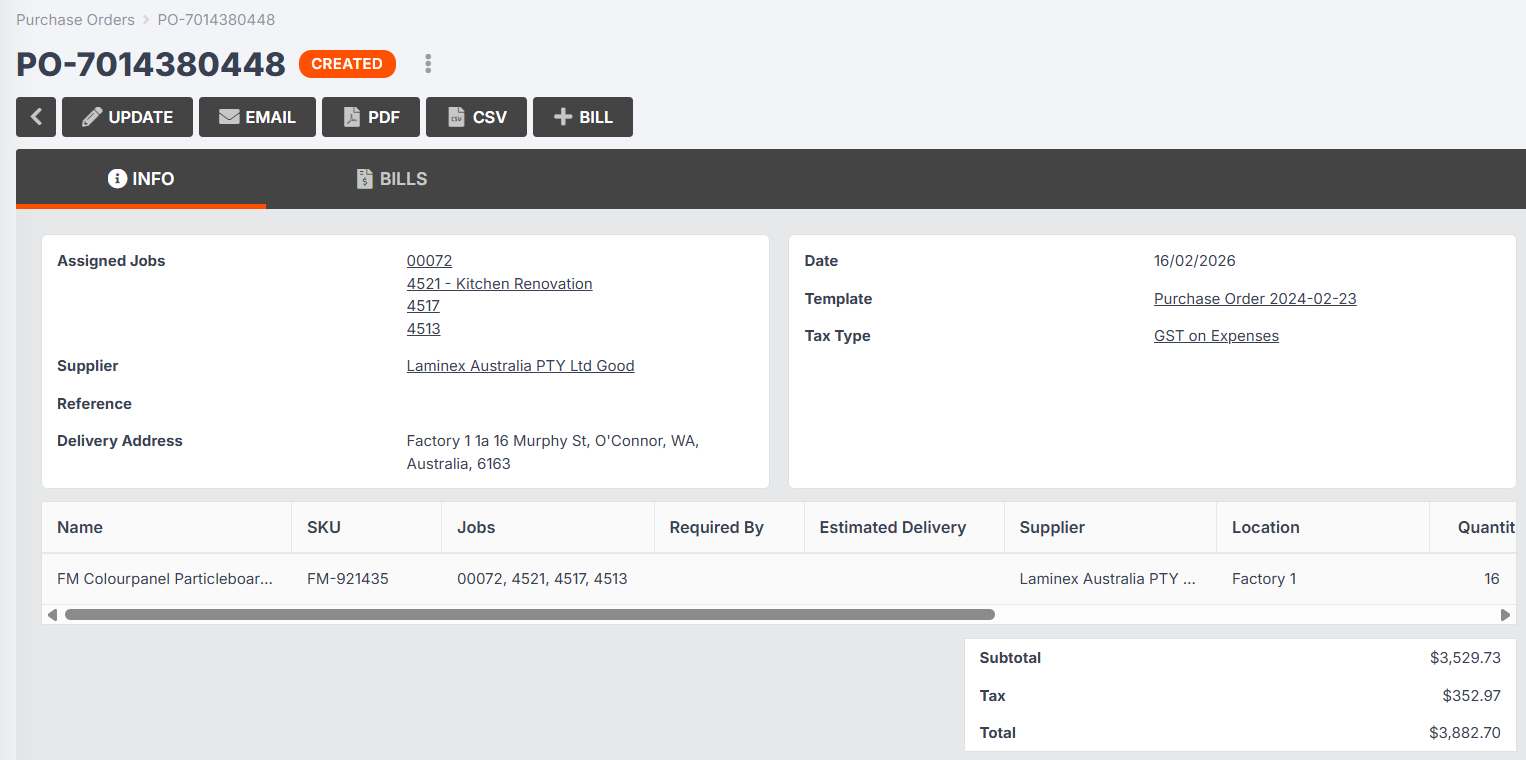 - Jobman will automatically allocate the items in the purchase order to the specific jobs they are intended for.