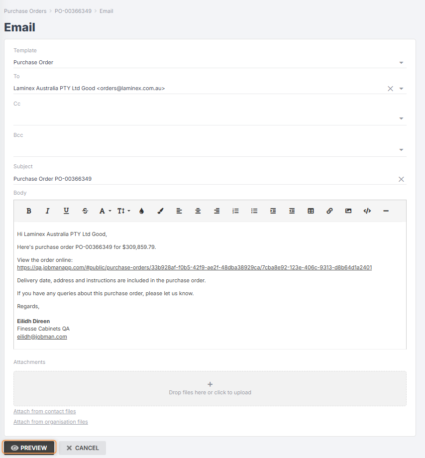 You can also export your purchase order to PDF or CSV, and manually attach to an email outside Jobman.