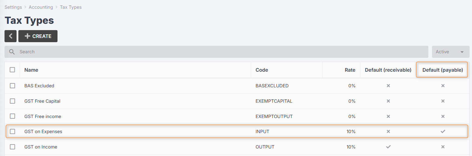 To view your default payable tax type, go to Settings > Accounting > Tax Types: