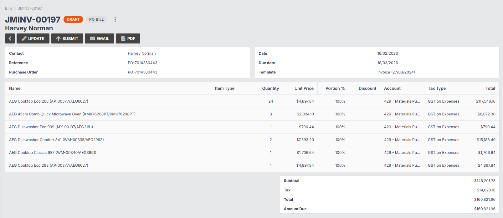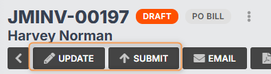 - You will be redirected to your draft bill. Click Update if you need to make any changes (e.g. to amounts, tax types, etc.), then click Submit to sync to your accounting software for payment.