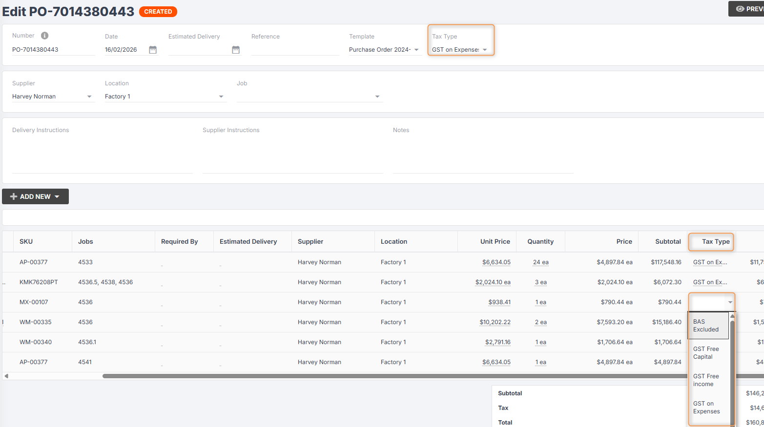 When you are editing a PO, however, you can click Tax Type at the top to change the tax type for the entire PO, or click into the Tax Type column for any individual item to set a specific tax type for that item: