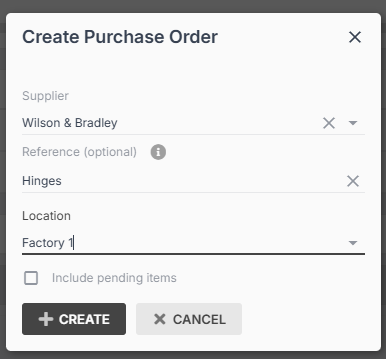 Select a supplier and location, and add a reference (optional). Tick Include pending items if you have already sourced materials to purchase order for this supplier inside this job.