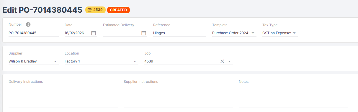 You will be redirected to a blank job purchase order. In the top fields, you can add/edit any of the following: Number, Date, Estimated Delivery, Reference, Template, Tax Type, Delivery Instructions, Supplier Instructions, Notes.