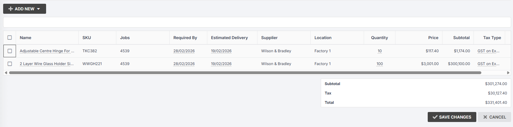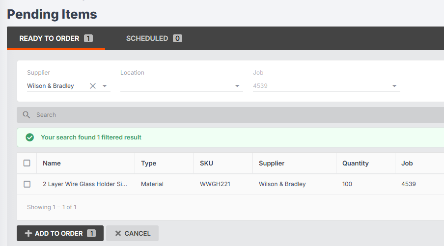 - Once all jobs have materials added to them and you are ready to send a purchase order, you can then create a purchase order and add all pending items to it for that particular supplier.