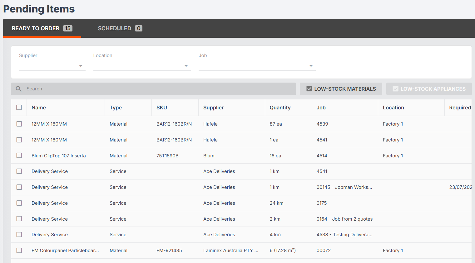 - Use the drop-downs at the top to filter by Supplier, Location, and/or Job.