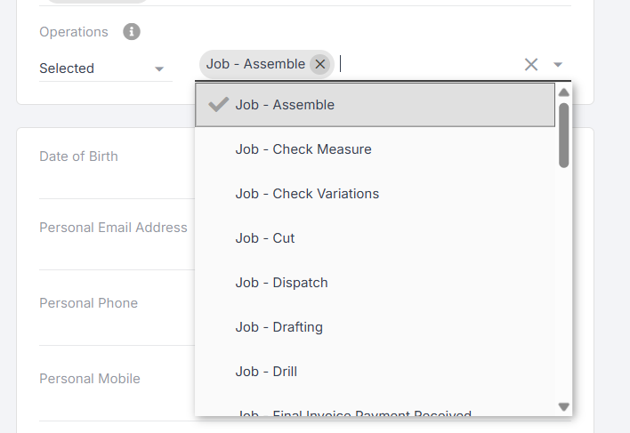 However, you can choose to restrict your staff member to selected operations, in which case a second drop-down will appear for you to choose which operations this staff member can track time against: