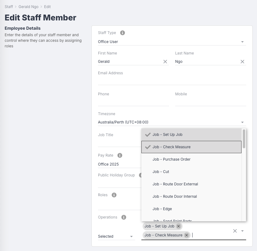 - Added the ability to restrict which operations specific staff members can record time and progress against