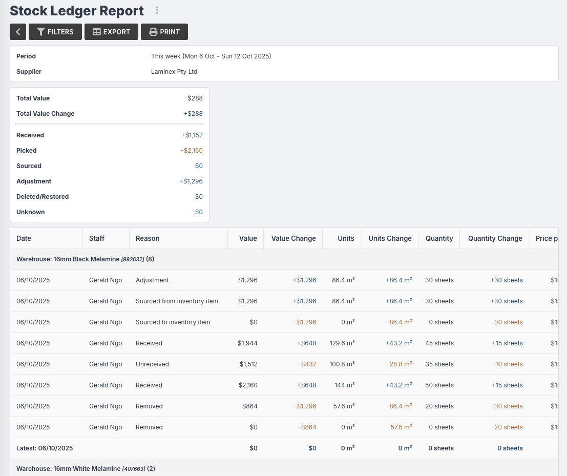 NB: The ledger report will start tracking as of the 07/10/2025, but will automatically be populated with the current value of your inventory as of the release date.