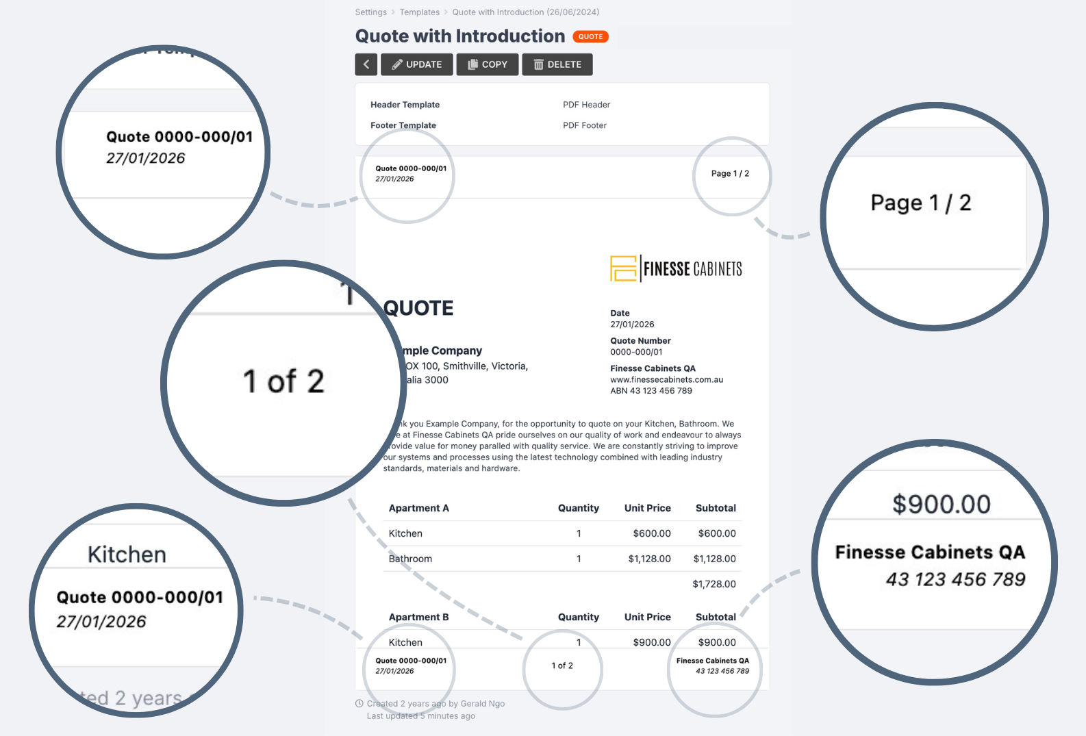 Make the right impression with your customers & team using custom PDF header and footer templates. Apply them to any of your PDF Templates, including Quotes, Invoices, Purchase Orders and more!