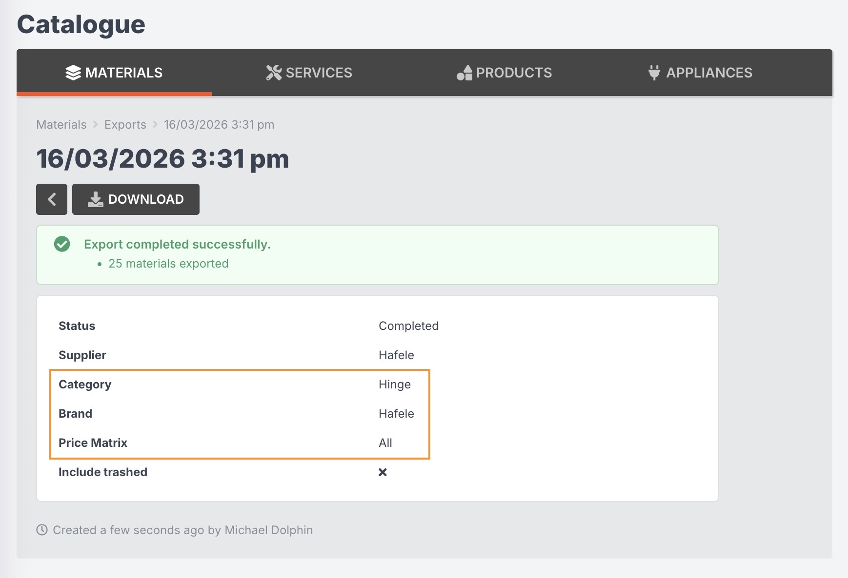 - Materials can be filtered by supplier, category, brand and price matrix